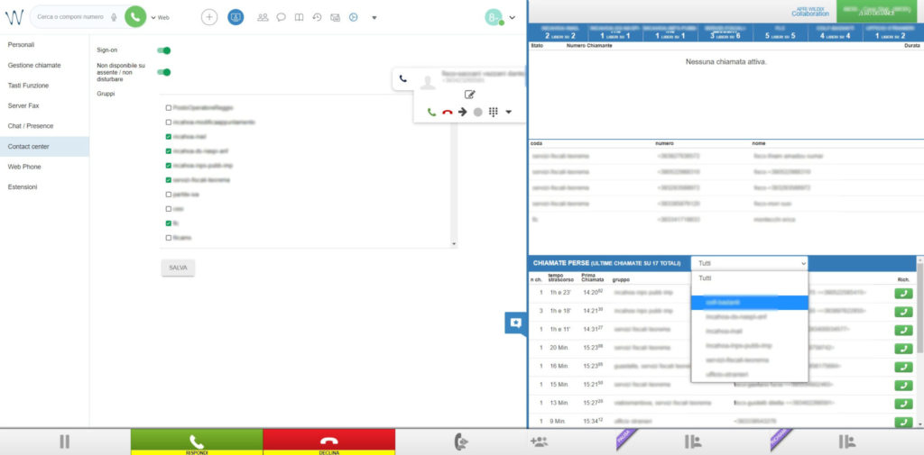 L’integrazione Dashboard permette agli operatori che rispondono al Call Center una completa gestione delle chiamate in ingresso. L’interfaccia consente la gestione delle chiamate in ingresso; ma anche delle chiamate perse, inoltre abbiamo inserito anche la Collaboration, cosi da mettere a disposizione tutte le altre funzionalità Wildix